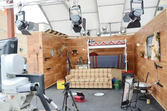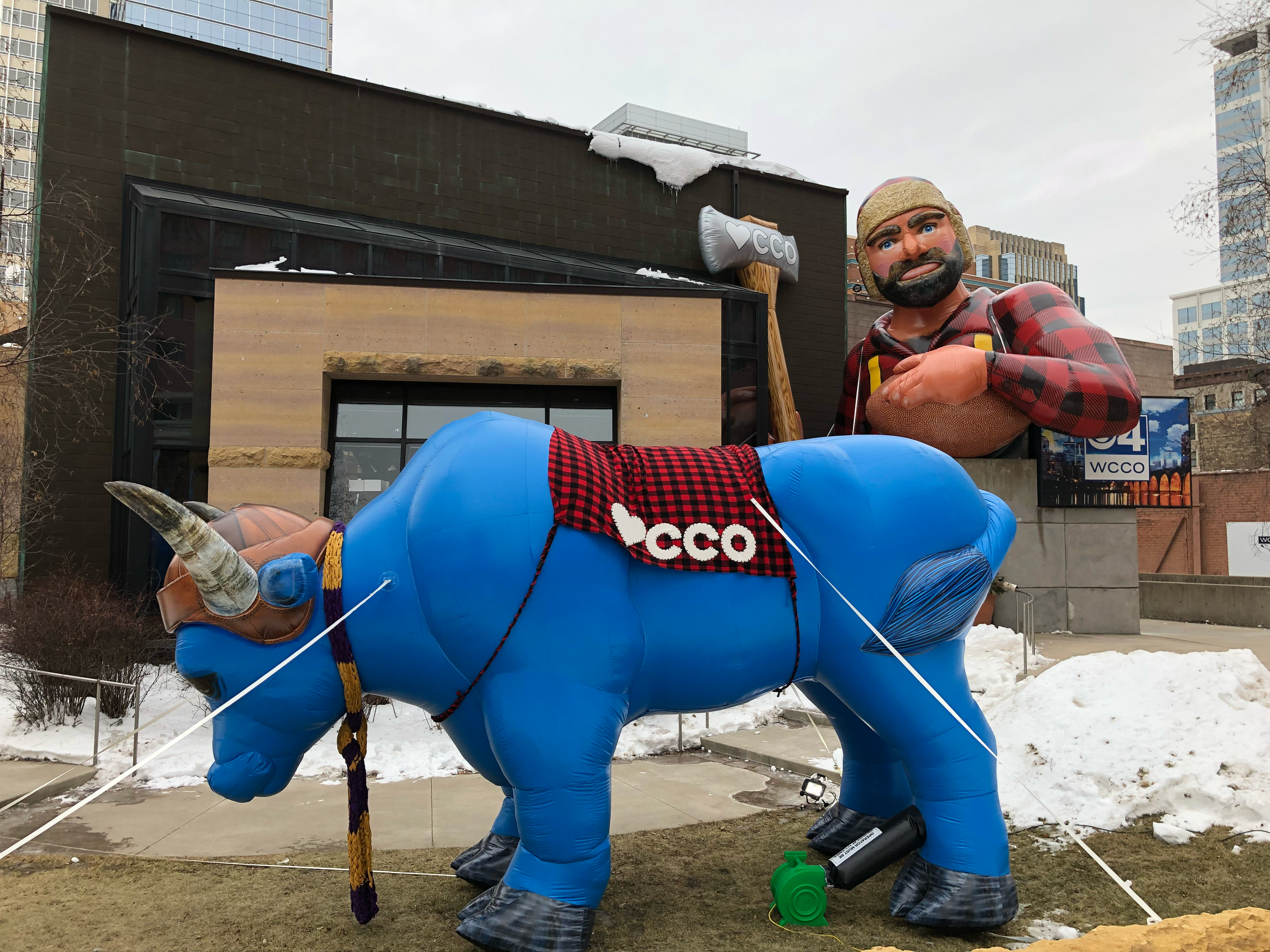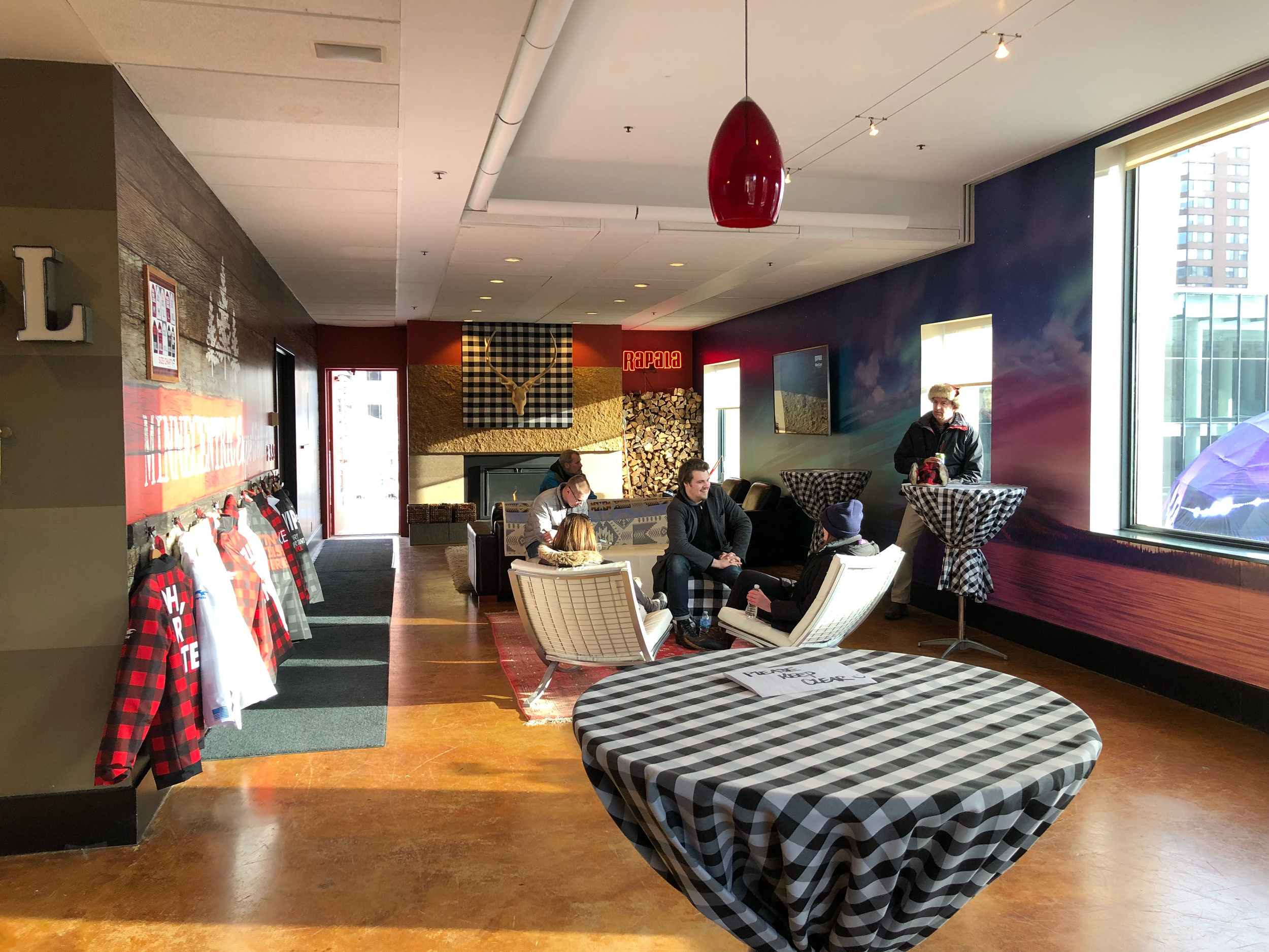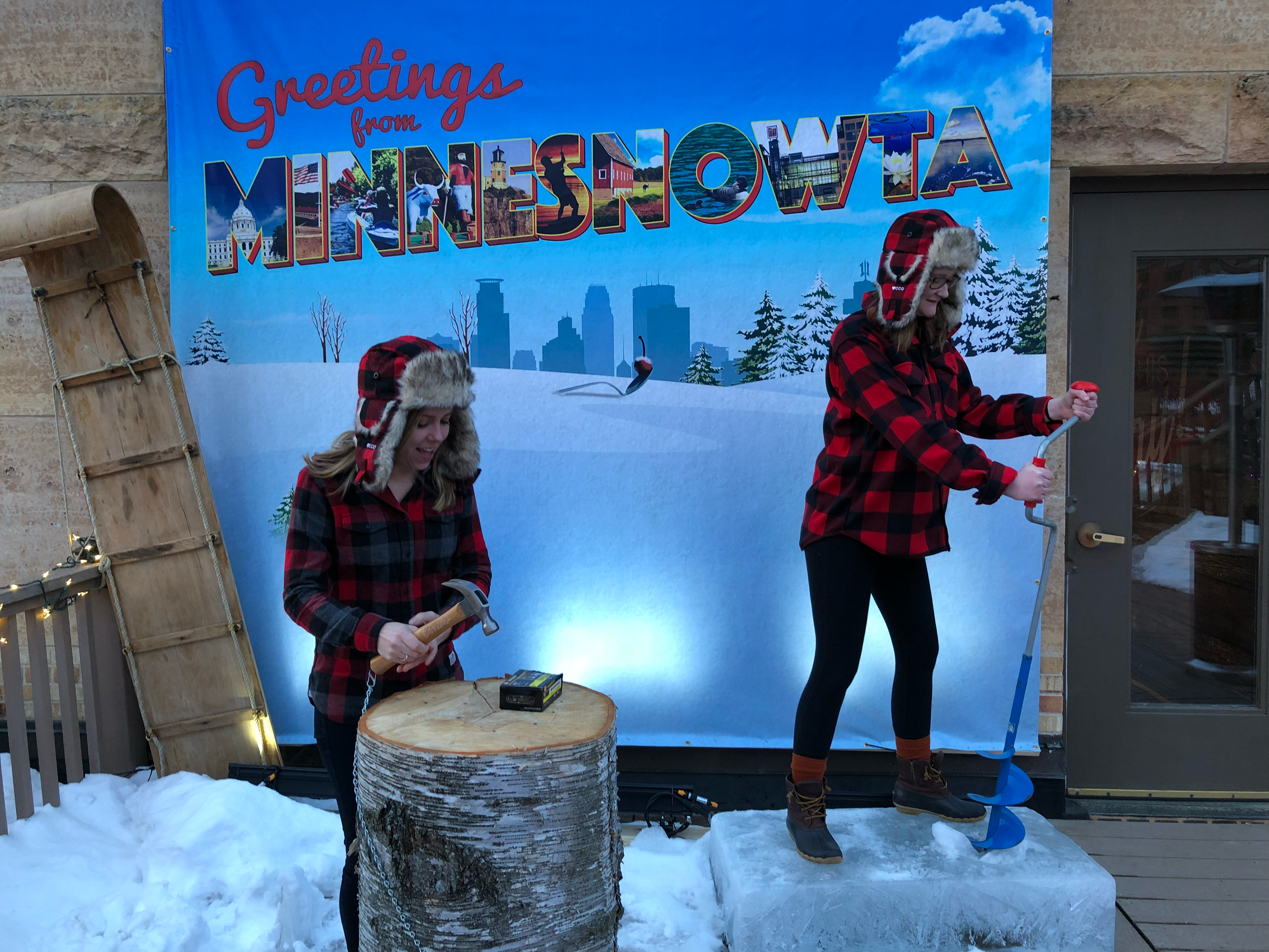 Executing this vision required massive logistical coordination and a hyper-local design approach. To create a stark contrast between the freezing outdoors and a deeply cozy indoor hospitality space, I focused on rich Minnesota textures and textiles, personally thrifting set pieces and even scoring a lived-in vintage couch off Craigslist. Outside, we used a crane to hoist a full-sized warming hut and an ATV onto the roof, completely converting a basic grill area into an authentic ice-fishing shanty complete with bunk beds. To ensure the event was unmissable, I commissioned custom 25-foot inflatables of Paul Bunyan and Babe the Blue Ox to loom over the festivities.